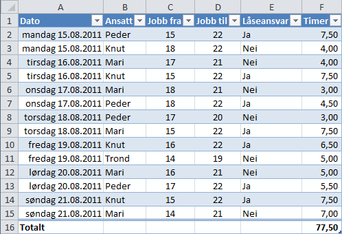 - Lag formelen som beregner antall timer de har jobbet; husk å legge på en ekstra halvtime dersom den ansatte hadde låseansvar.