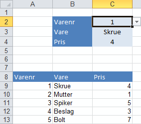 Excel kan i mange tilfeller brukes som en enkel database, hvor man gjør oppslag mot en tabell. I dette tilfellet skal vi la brukeren taste inn varenummeret, så skal varenavn og pris fremkomme automatisk.