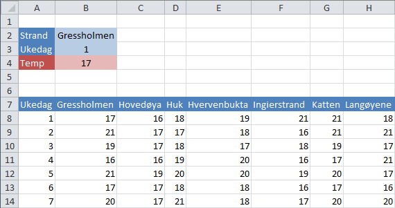 Bruk FINN.KOLONNE til å slå opp vanntemperaturen fra valgt badestrand på valgt ukedag.