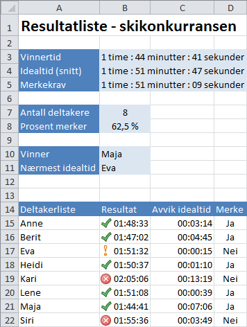 - Bruk betinget formatering, og sett inn et ikonsett som synliggjør hvem som har fått merke, hvem som ikke fikk merke men var under idealtiden, og hvem som var over idealtiden.