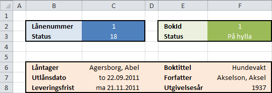 - Bruk betinget formatering slik at alle andre bokstatuser enn "På hylla" gir rød bakgrunn.