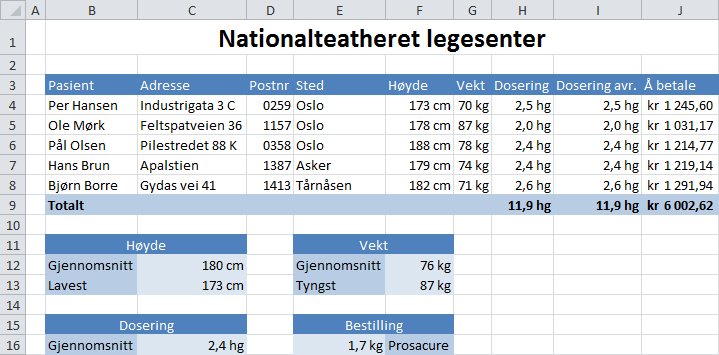 Vi ønsker også å få vite hvor stor gjennomsnittsdosen er, samt at vi må få regnearket til å fortelle oss hvor mange kilo Prosacure vi må bestille til våre pasienter. For å være på den sikre siden, ønsker vi å bestille 0,5 kilo mer enn hva utregningen tilsier.