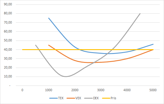 Diagrammet er basert på en tabell med data som er gitt for en bedrift som selger sitt ene produkt på et prisfast marked med fullkommen konkurranse (atomistisk marked).